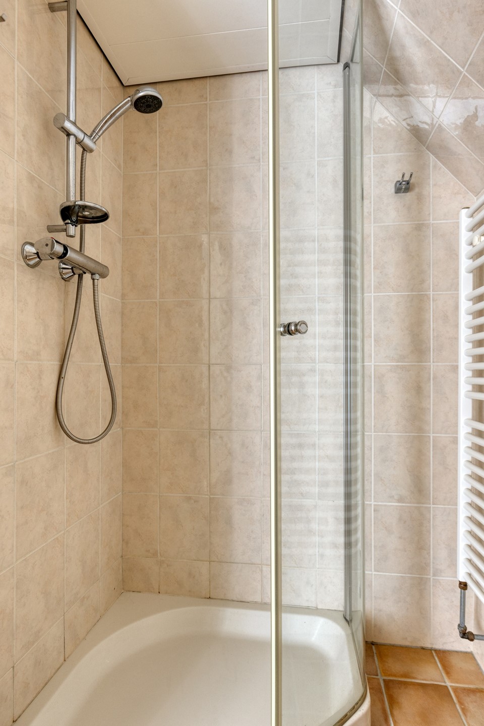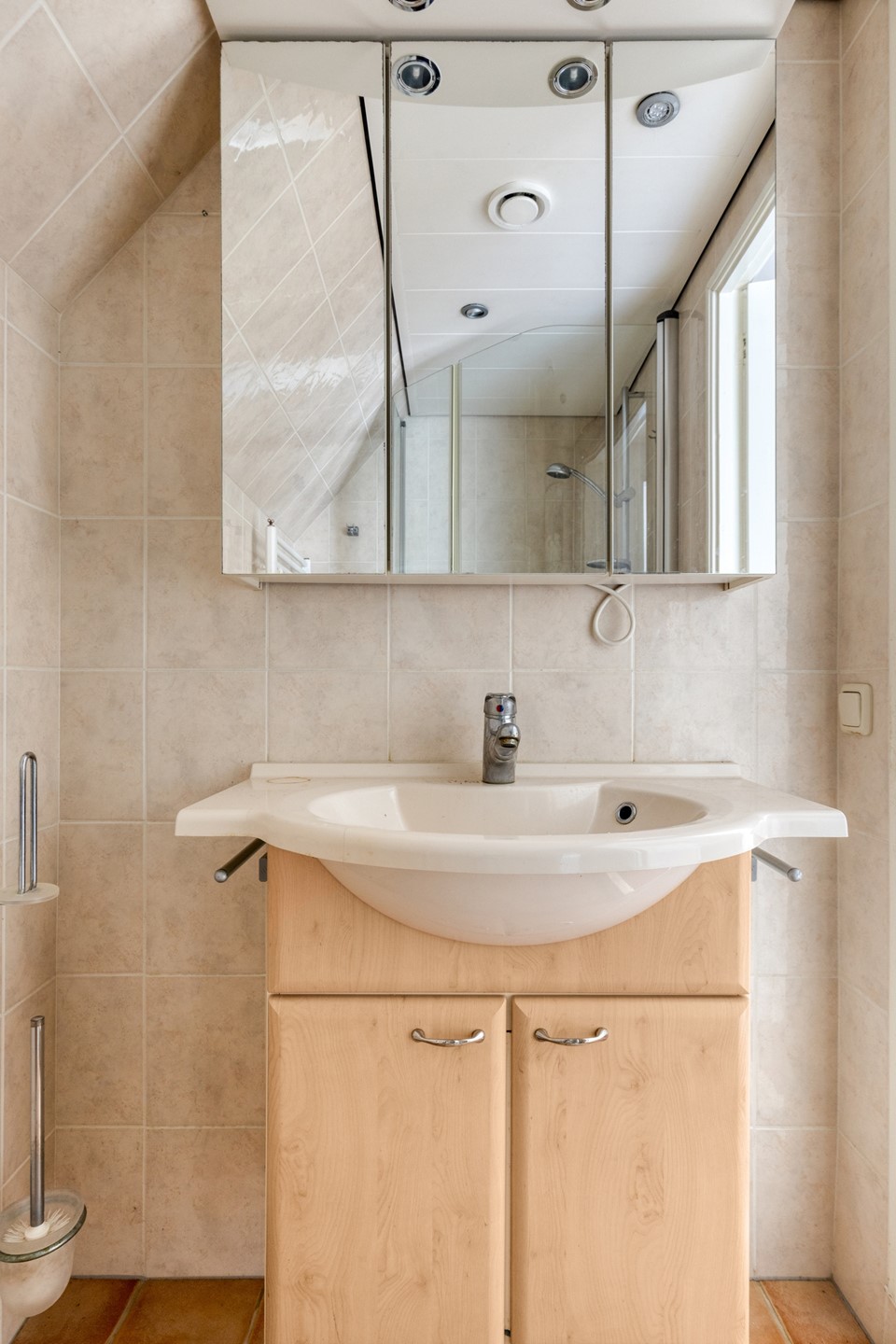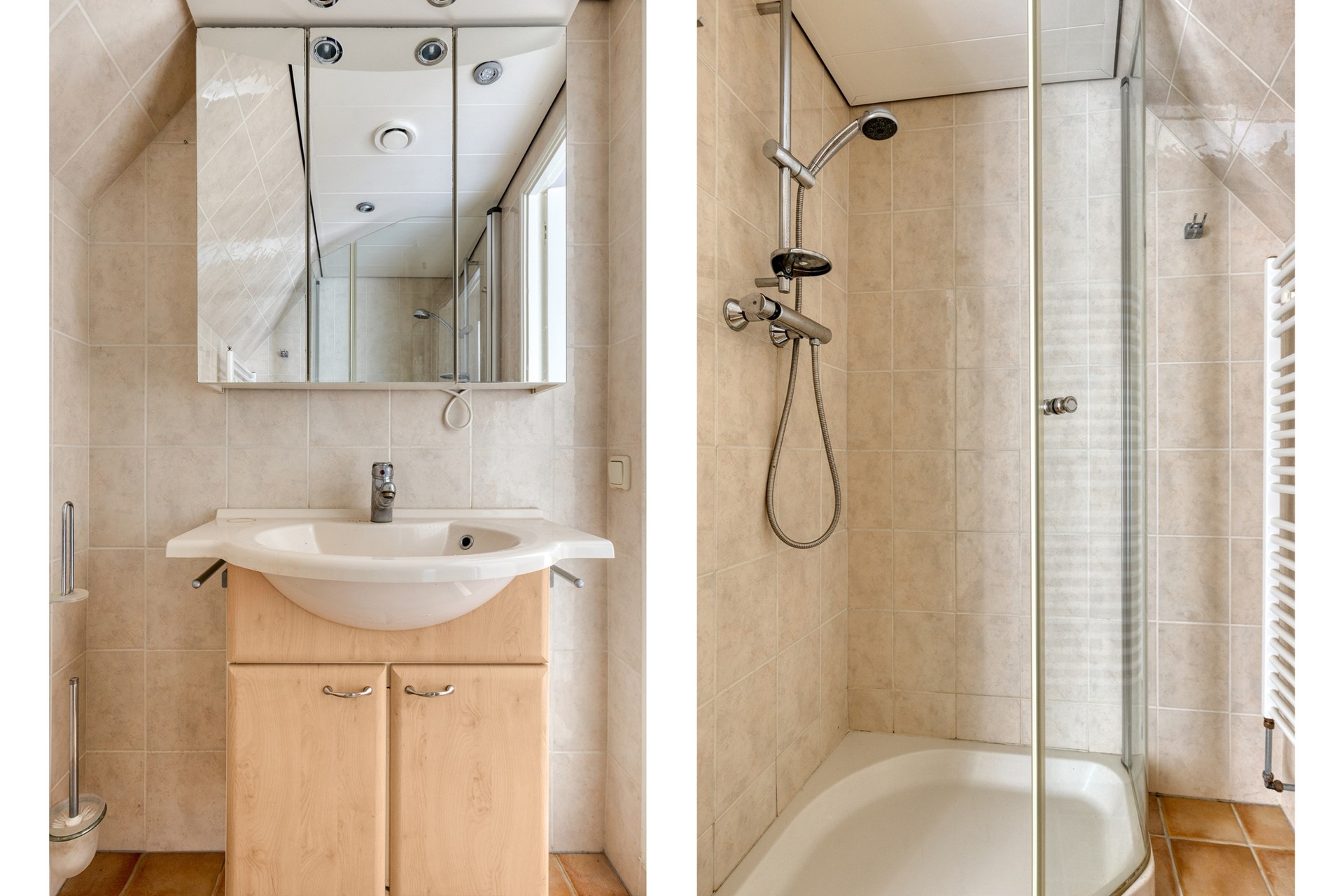 Vanaf de overloop zijn de drie slaapkamers bereikbaar en de nette badkamer met inloopdouche, hangcloset en wastafelmeubel. Twee slaapkamer beschikken over een dakkapel en vaste kasten. Vanaf de overloop brengt een vlizotrap je naar de ruime bergzolder met 2 dakramen en de CV- ketel, merk Vaillant.