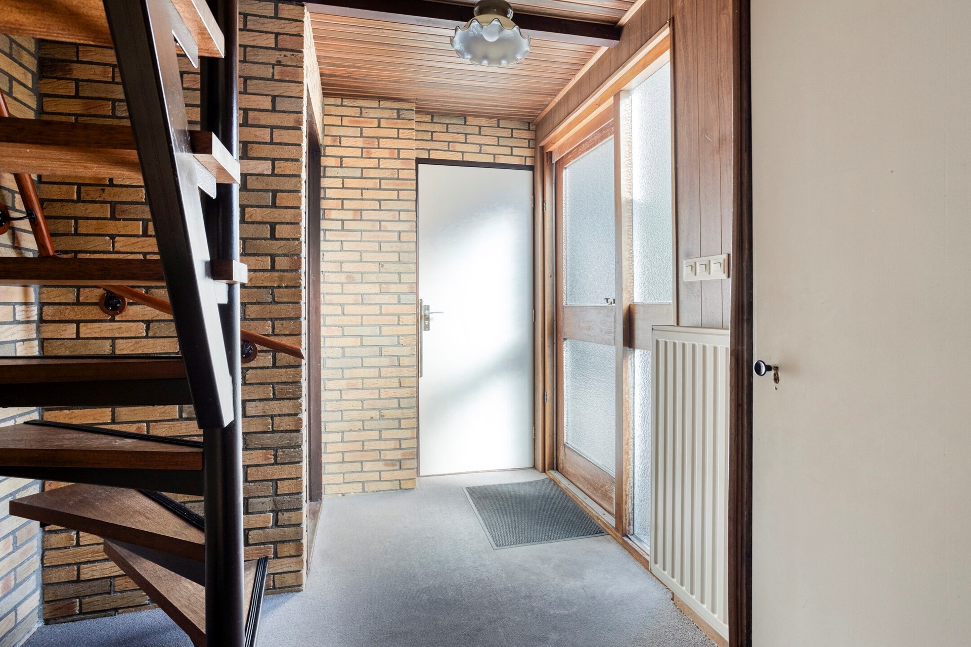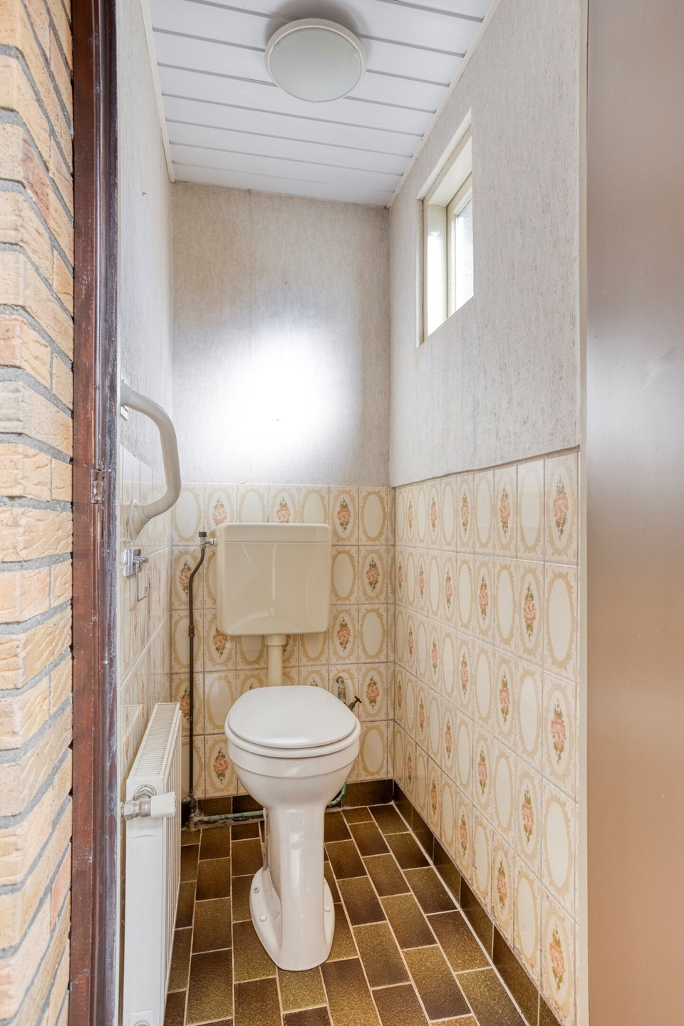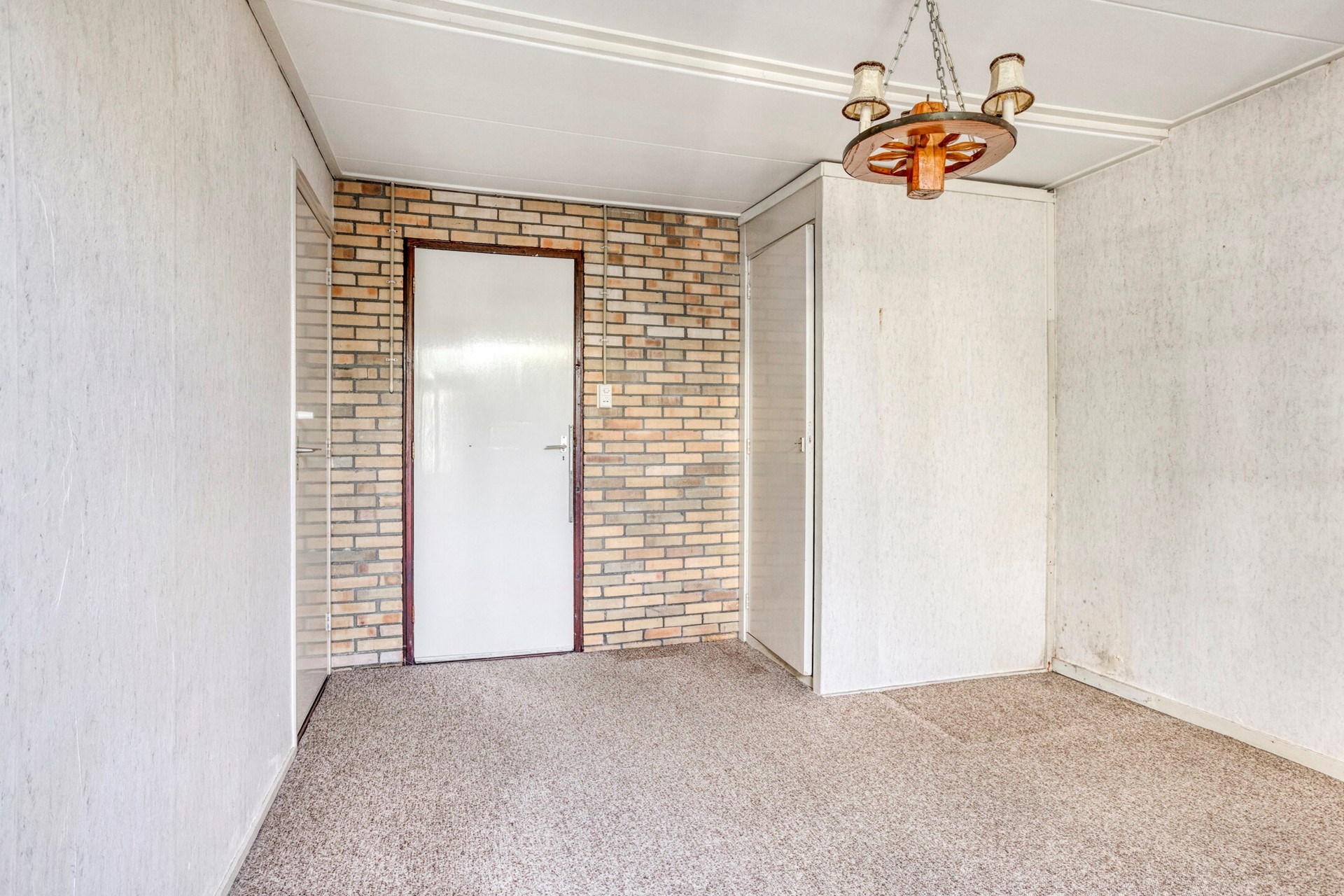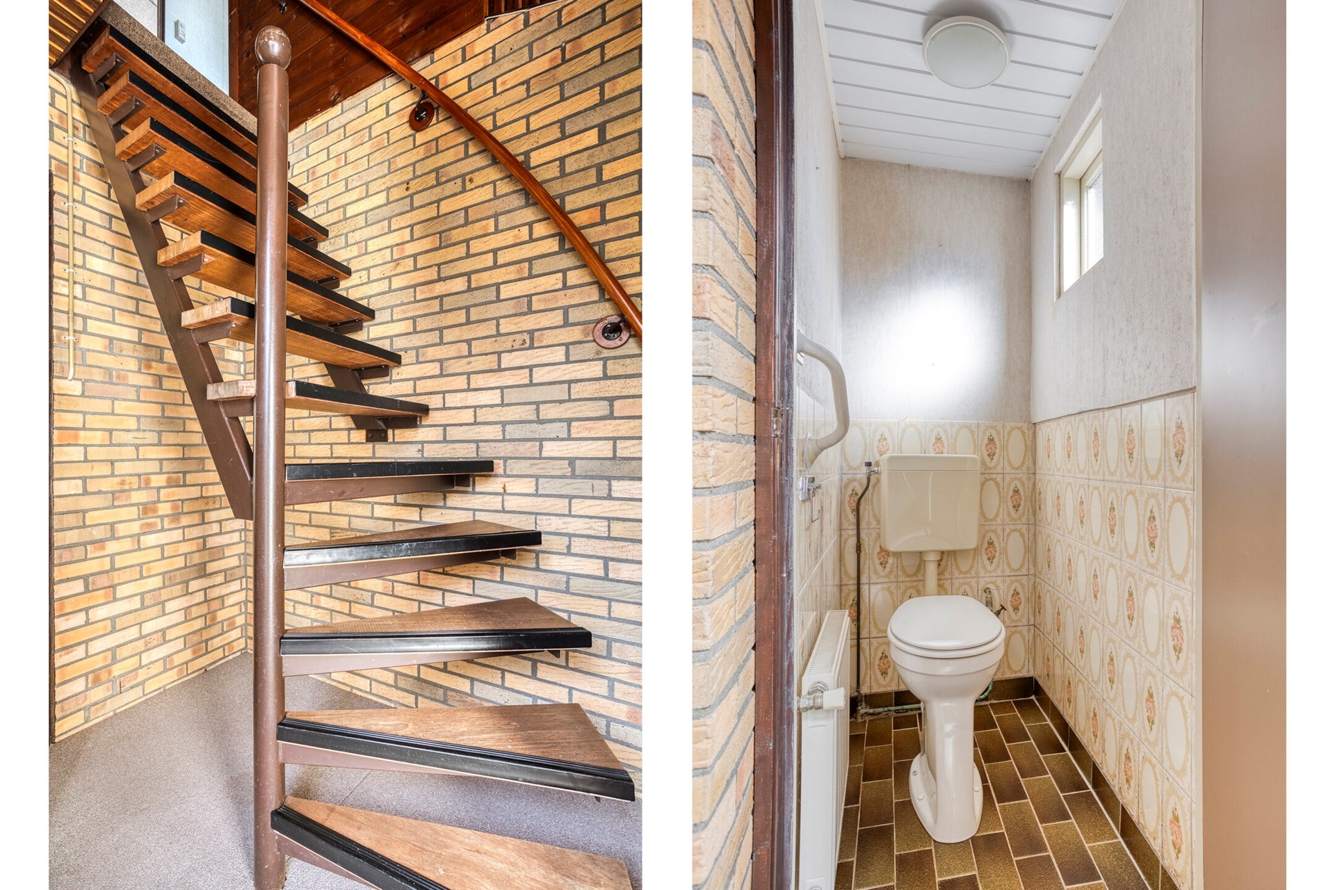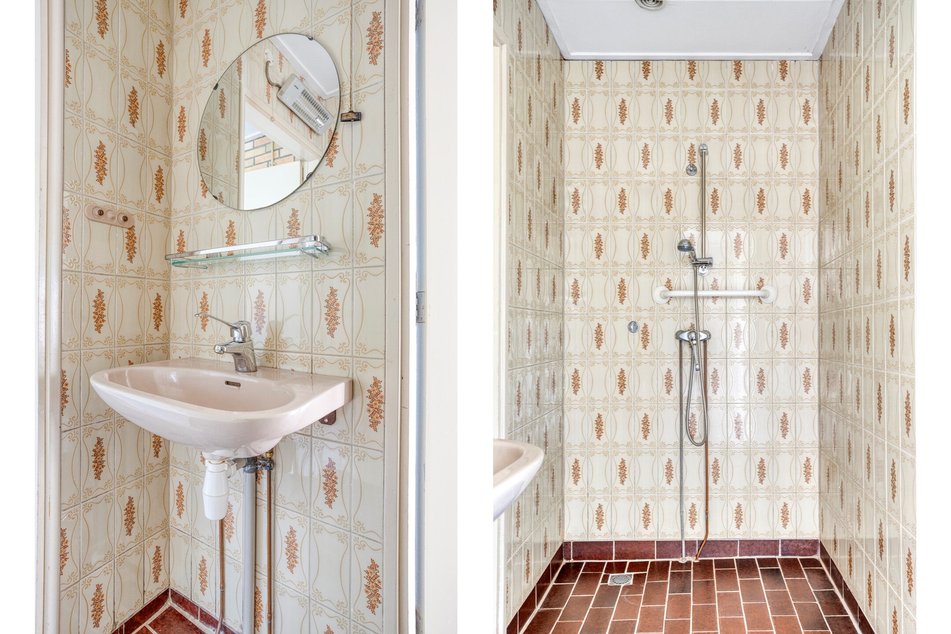 Entree aan zijkant woning met trapopgang, meterkast en toilet, woonkamer aan voorzijde met veel lichtinval, ruime slaapkamer met vaste kast, verbinding naar badkamer met douche en wastafel, keuken met eenvoudige inbouwkeuken met witgoedaansluitingen en CV-ketel.